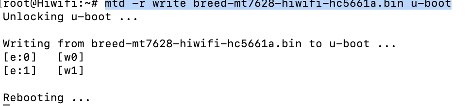 STEP 4: mtd -r write breed-mt7628-hiwifi-hc5661a.bin u-boot 注意-r表示重启,写入成功以后会自动重启。 成功截图如下图所示