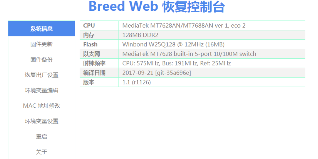 - STEP 2: 接着可以看到极路由开始闪了,只有左边第一个灯亮着,然后等待一会,用网线直接连极路由左边第一个路由口,WAN口,然后直接连上电脑。然后电脑关闭wifi。输入192.168.1.1 进入breed界面。如下图所示。